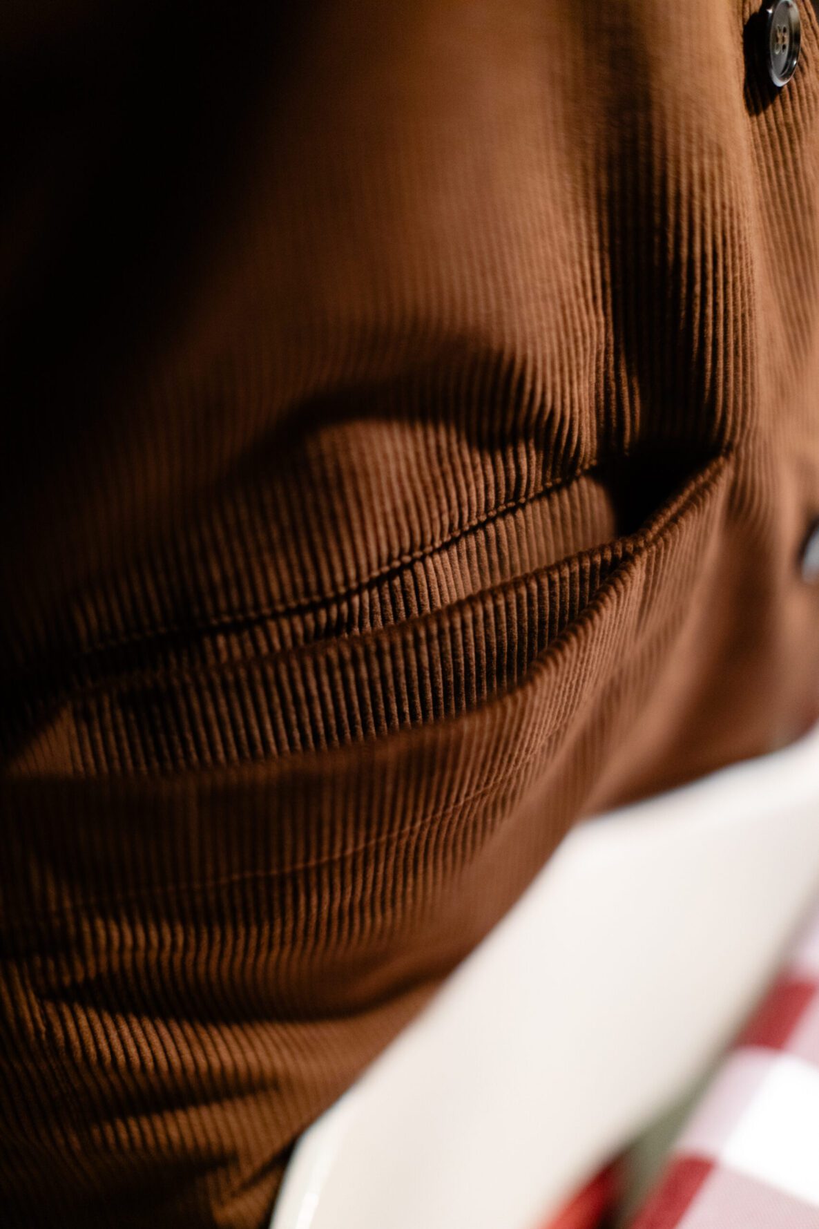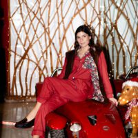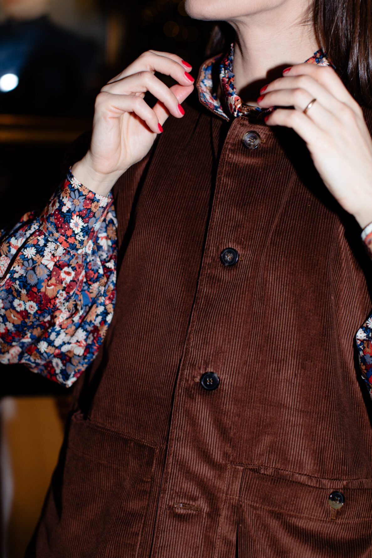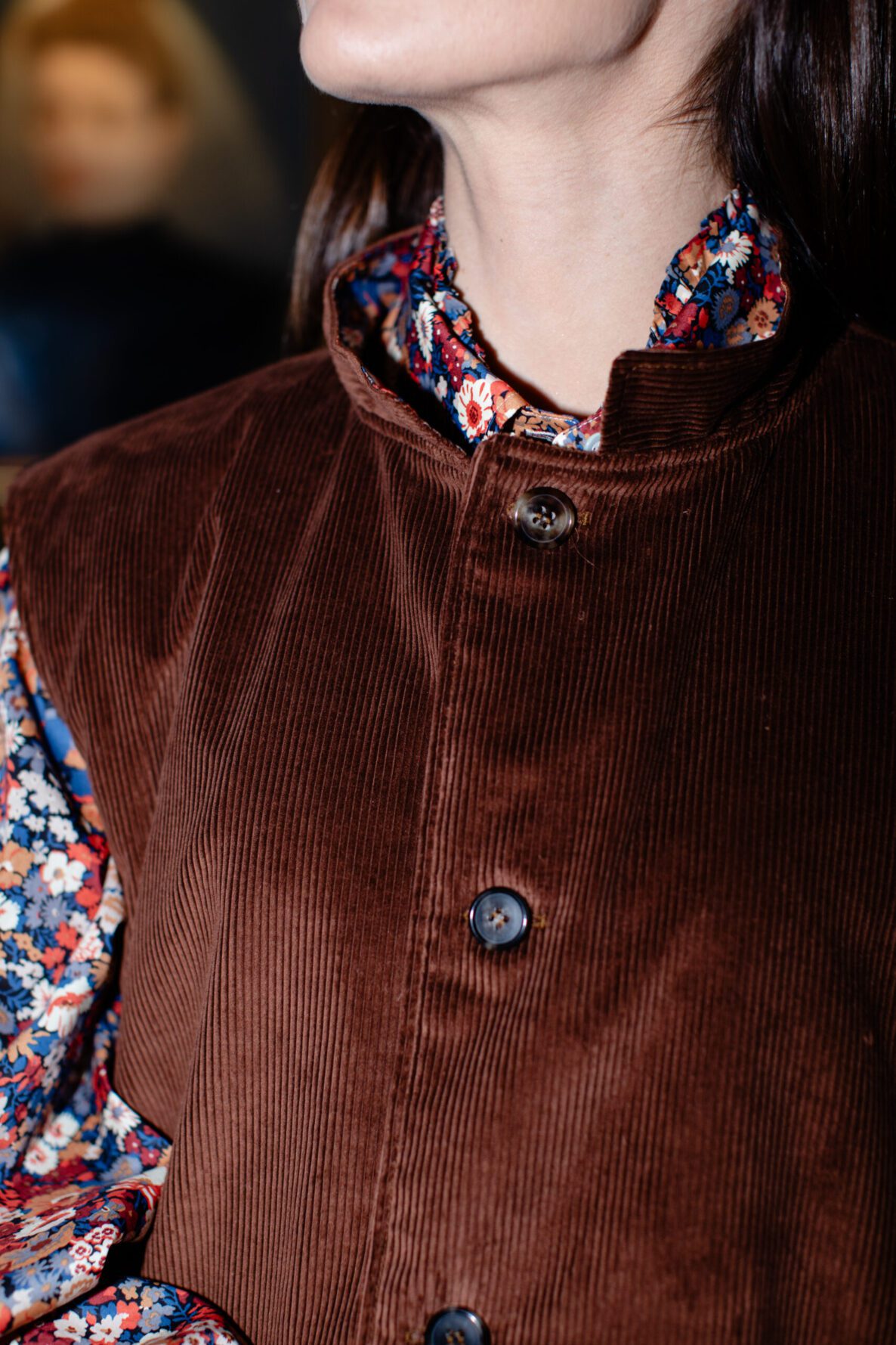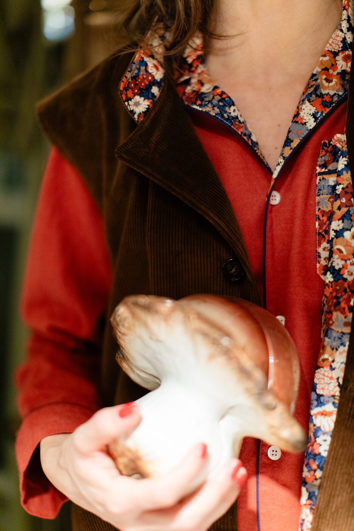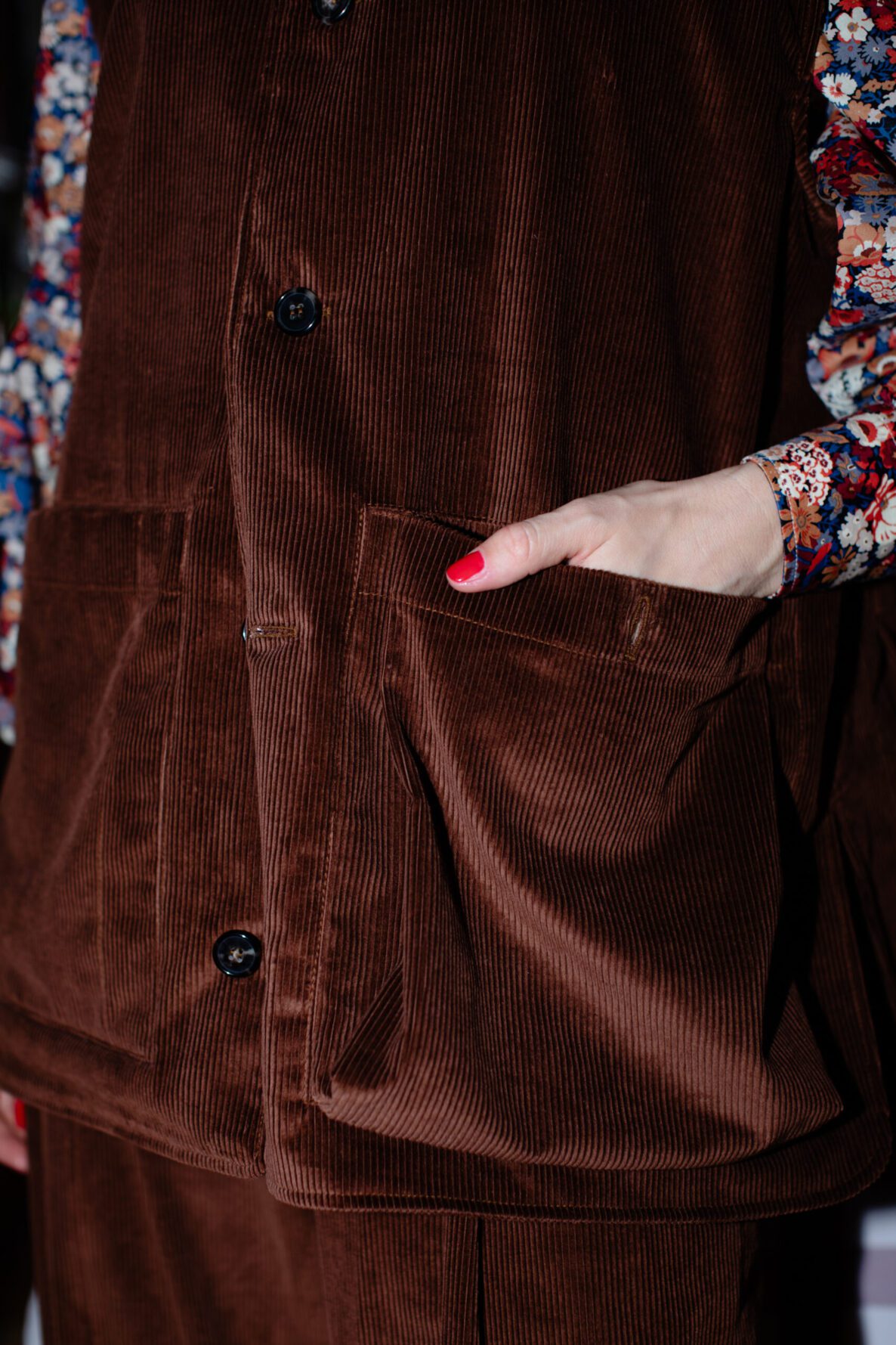 Inspired by the traditional gardening waistcoat and transformed into couture, the cut is impeccable: a refined stand collar, an over and architectural fit that honours heritage workwear proportions, and sartorial construction throughout. Inside, the vest is lined in Liberty Thorpe, a beautifully dense floral design that adds a hidden layer of colour and poetry close to the body. The horn buttons were personally chosen by Maddalena to harmonise perfectly with the tone of the velvet.