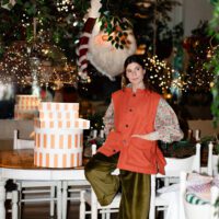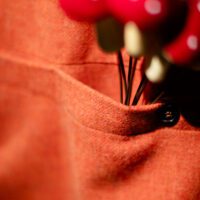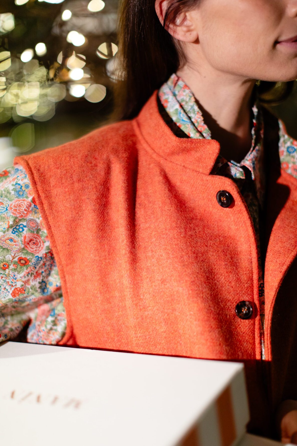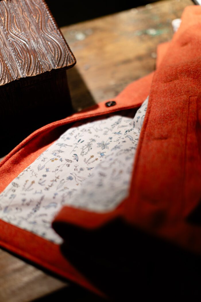 The Manìn Gardener Vest is a poetic celebration of gardens, craftsmanship and everyday beauty. This women’s edition is crafted in Italy from authentic Scottish Shetland wool in a joyful lobster orange shade, warm, tactile and full of natural character. Inside, the vest is lined in Liberty Theo, a nostalgic print filled with tiny childlike drawings in soft blues and touches of yellow, bringing a secret note of innocence and wonder close to the heart.